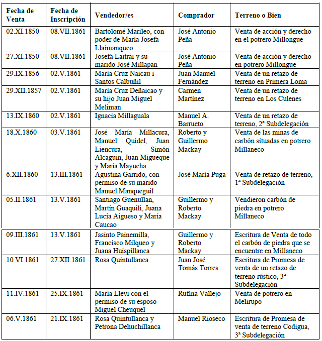 En dos de Noviembre de mil ochocientos cincuenta, i ante el Juez de primera Instancia de Santa Juana, el indíjena Bartolomé Marileo, con poder de Josefa Illaimanque, otorgó escritura de venta de la acción i derecho que a esta correspondía en el potrero Millongue, ubicado en lo interior de este departamento, a favor de don José Antonio Peña, vecino de este, en cantidad de sesenta pesos.28