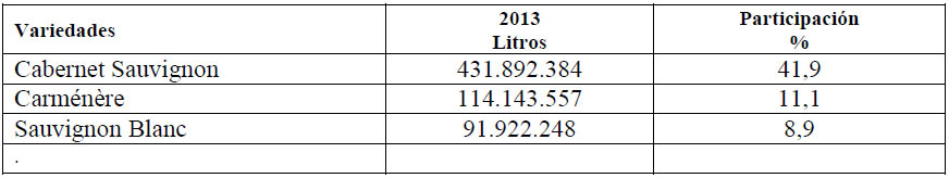 El análisis de los volúmenes porcentuales de vino producidos en Chile, con cifras del 2013, para las diferentes variedades (Figura 5) puede permitir una proyección del comportamiento futuro de las tres variedades analizadas en este artículo.